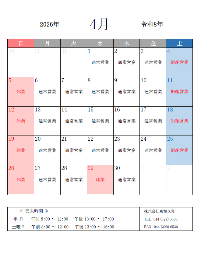 2026年4月営業日時のお知らせ